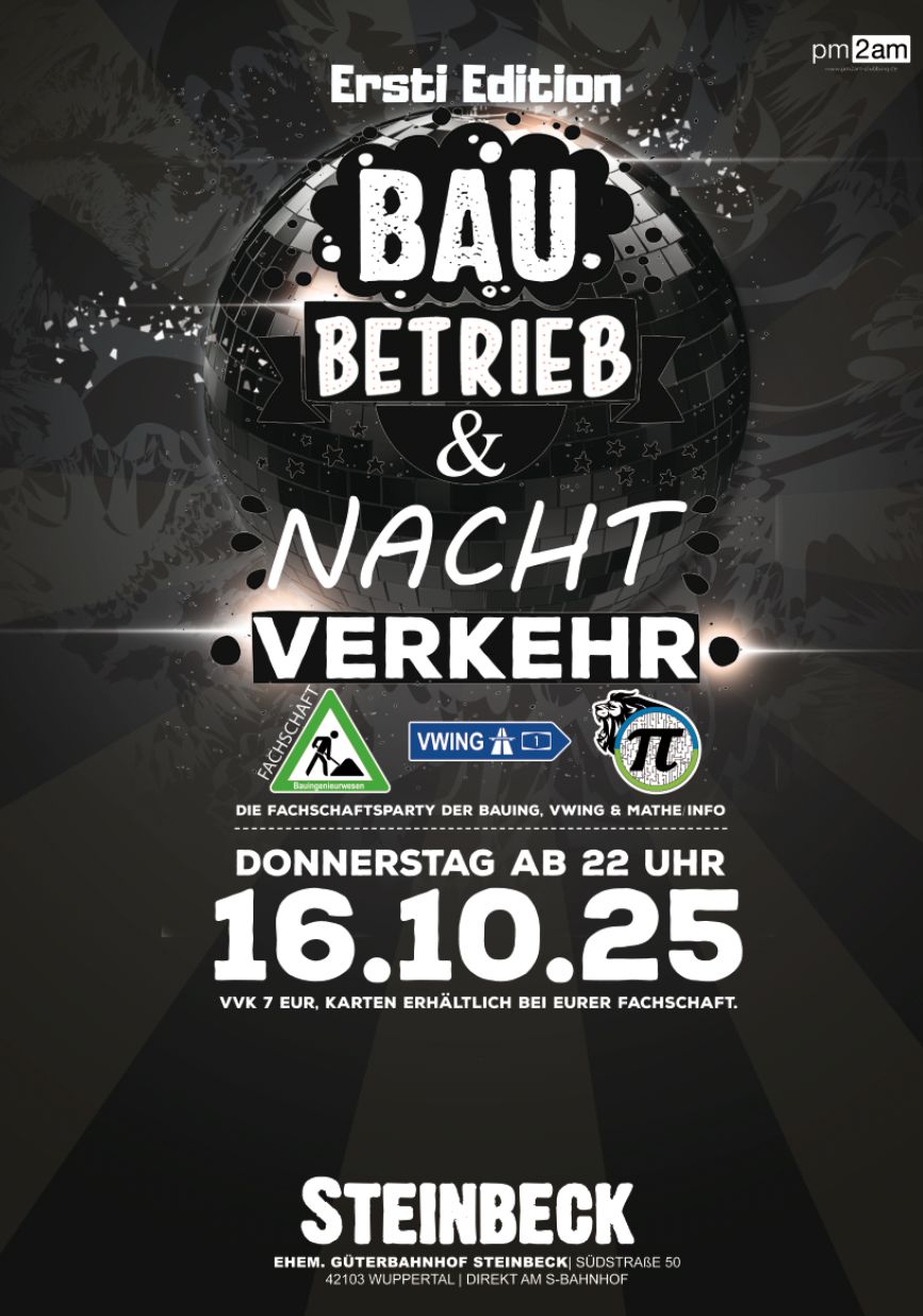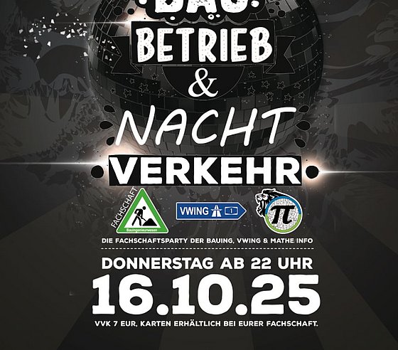 Im Rahmen der Ersti-Woche findet am 16.10.2025 die nächste BAUBETRIEB & NACHTVERKEHR - Party statt, diesmal in Kooperation mit der Fachschaft Mathe Info.